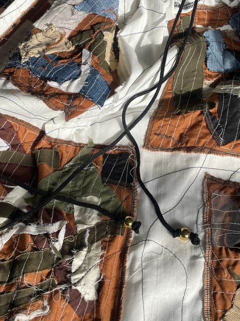 Medium - upcycled camo, grass, paint, upcycled cottons, aluminum cans