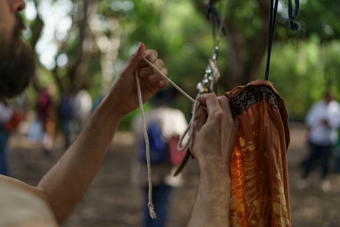 All Material Comes From the Earth is a site-specific performance and wearable art piece installation inspired by the mango groves. This time based work consists of ten handmade unique upcycled outfits, presented outdoors on the grounds of the Deering Estate. The work begins with a runway, in which models wear the outfits, before undressing and hanging them from trees. While suspended, the garments are exposed to the elements, to wear, discolor, and altogether transform into different objects entirely through natural processes. The materials selected for the construction of the garments vary and were chosen based on their use and the interactions they inspire. These materials include donated clothing, papers, plants, and recyclables.