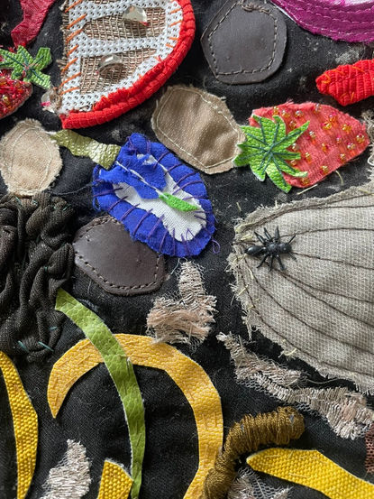 Hand pieced, appliqued, beaded, dyed, and embroidered, and sewn fiber art wall hanging depicting a compost pile by Pangea Kali Virga. Made in Miami at the Pangea Kali Virga Little River and Oolite Arts studio.