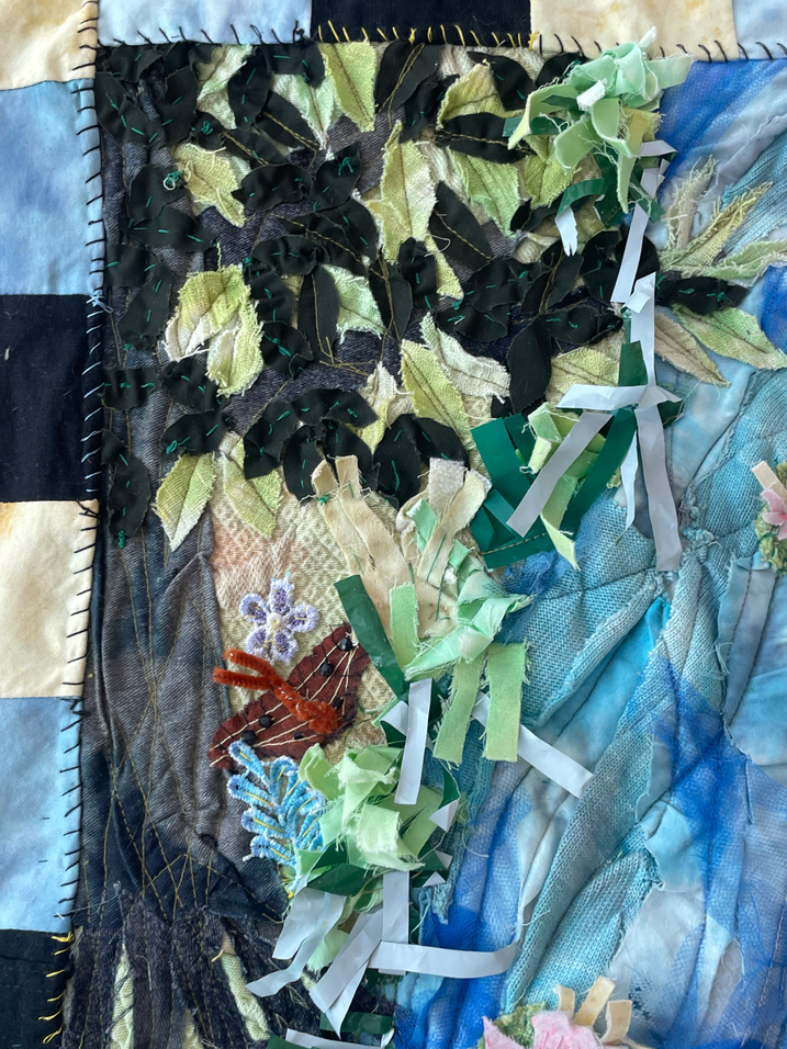 These two quilts, In The Arms of The Everglades and If The Sacred Is A River Within Us, Let It Flow Like This Forever, were crafted by the Miami community over the course of six sewing circle sessions led by local sustainable fiber artist, Pangea Kali Virga, and hosted at the Miami Beach Regional YouMake space. The sewing circles taking place from August through December of 2024 welcomed dozens of participants with ages ranging from 2 to 80 who worked on dyeing the fabrics, cutting the patterns and motifs, pinning the elements together, and sewing the layers together to create two finished quilted landscapes. The landscapes depict and are inspired by various regional ecosystems in the Everglades as well as native plants and animals including the Anhinga bird, Julia butterfly, and Mangrove trees. The quilt borders take direct inspiration from various patchwork designs from the Miccosukkee. The materials for the two quilts were upcycled and repurposed from old military jackets, bed linens, clothing, net fruit packaging, vintage bridal lace, and more. All scraps leftover from the quilt making process will be further repurposed in new art works.